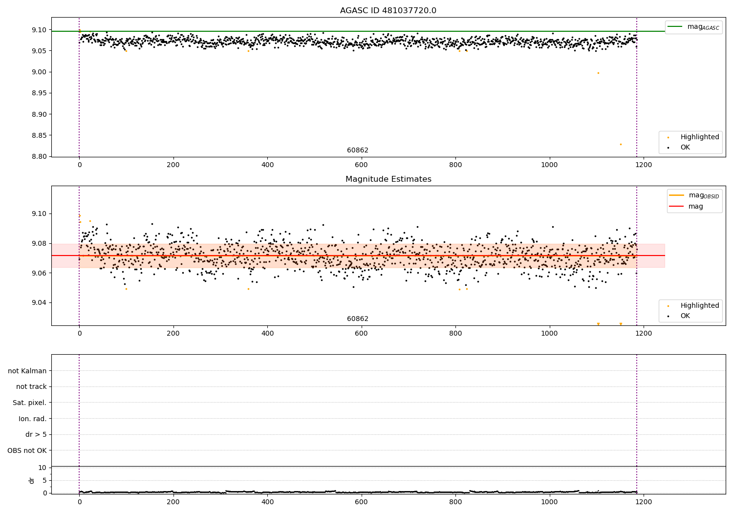 | OBSID | Time | Row | Col | N | Nok | Nout | ftrack | fdr3 | fdr5 | fok | ⟨ δ mag ⟩ 100s | ⟨ mag ⟩ | σmag | Comments |