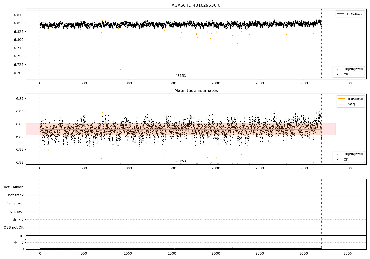 | OBSID | Time | Row | Col | N | Nok | Nout | ftrack | fdr3 | fdr5 | fok | ⟨ δ mag ⟩ 100s | ⟨ mag ⟩ | σmag | Comments |