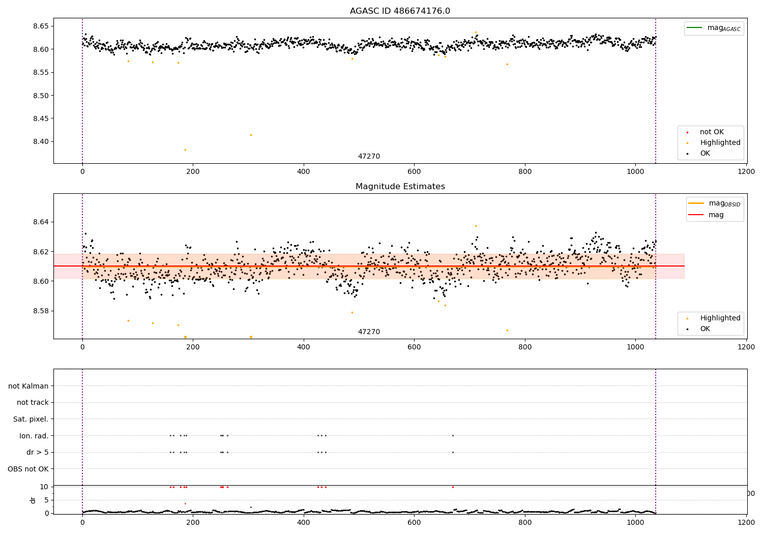 | OBSID | Time | Row | Col | N | Nok | Nout | ftrack | fdr3 | fdr5 | fok | ⟨ δ mag ⟩ 100s | ⟨ mag ⟩ | σmag | Comments |