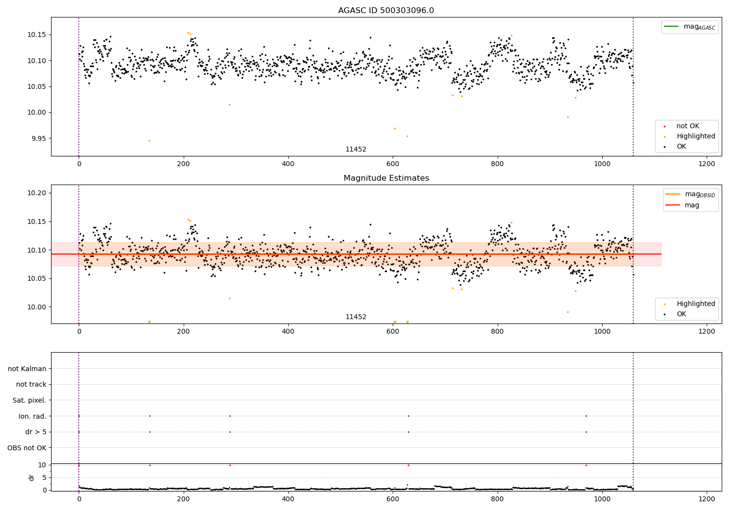| OBSID | Time | Row | Col | N | Nok | Nout | ftrack | fdr3 | fdr5 | fok | ⟨ δ mag ⟩ 100s | ⟨ mag ⟩ | σmag | Comments |