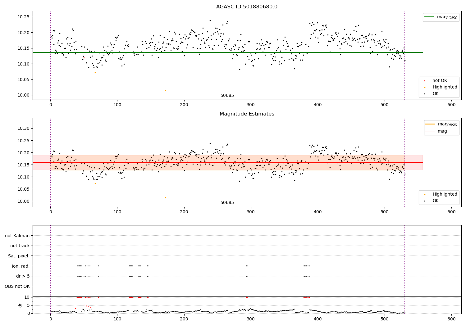 | OBSID | Time | Row | Col | N | Nok | Nout | ftrack | fdr3 | fdr5 | fok | ⟨ δ mag ⟩ 100s | ⟨ mag ⟩ | σmag | Comments |