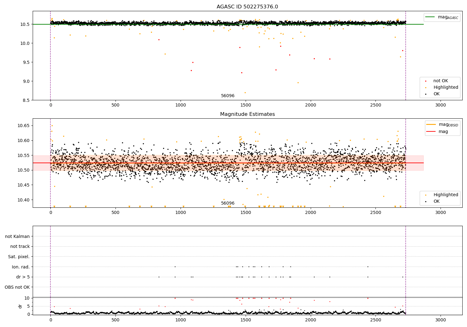 | OBSID | Time | Row | Col | N | Nok | Nout | ftrack | fdr3 | fdr5 | fok | ⟨ δ mag ⟩ 100s | ⟨ mag ⟩ | σmag | Comments |