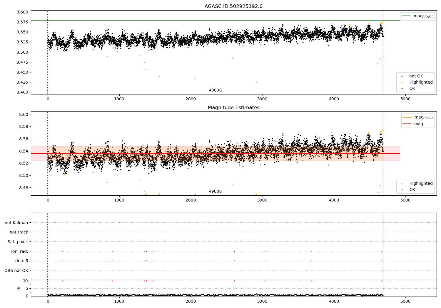 | OBSID | Time | Row | Col | N | Nok | Nout | ftrack | fdr3 | fdr5 | fok | ⟨ δ mag ⟩ 100s | ⟨ mag ⟩ | σmag | Comments |