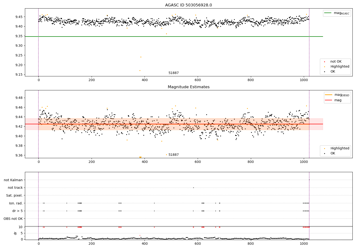 | OBSID | Time | Row | Col | N | Nok | Nout | ftrack | fdr3 | fdr5 | fok | ⟨ δ mag ⟩ 100s | ⟨ mag ⟩ | σmag | Comments |