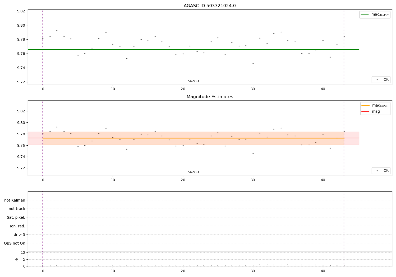 | OBSID | Time | Row | Col | N | Nok | Nout | ftrack | fdr3 | fdr5 | fok | ⟨ δ mag ⟩ 100s | ⟨ mag ⟩ | σmag | Comments |