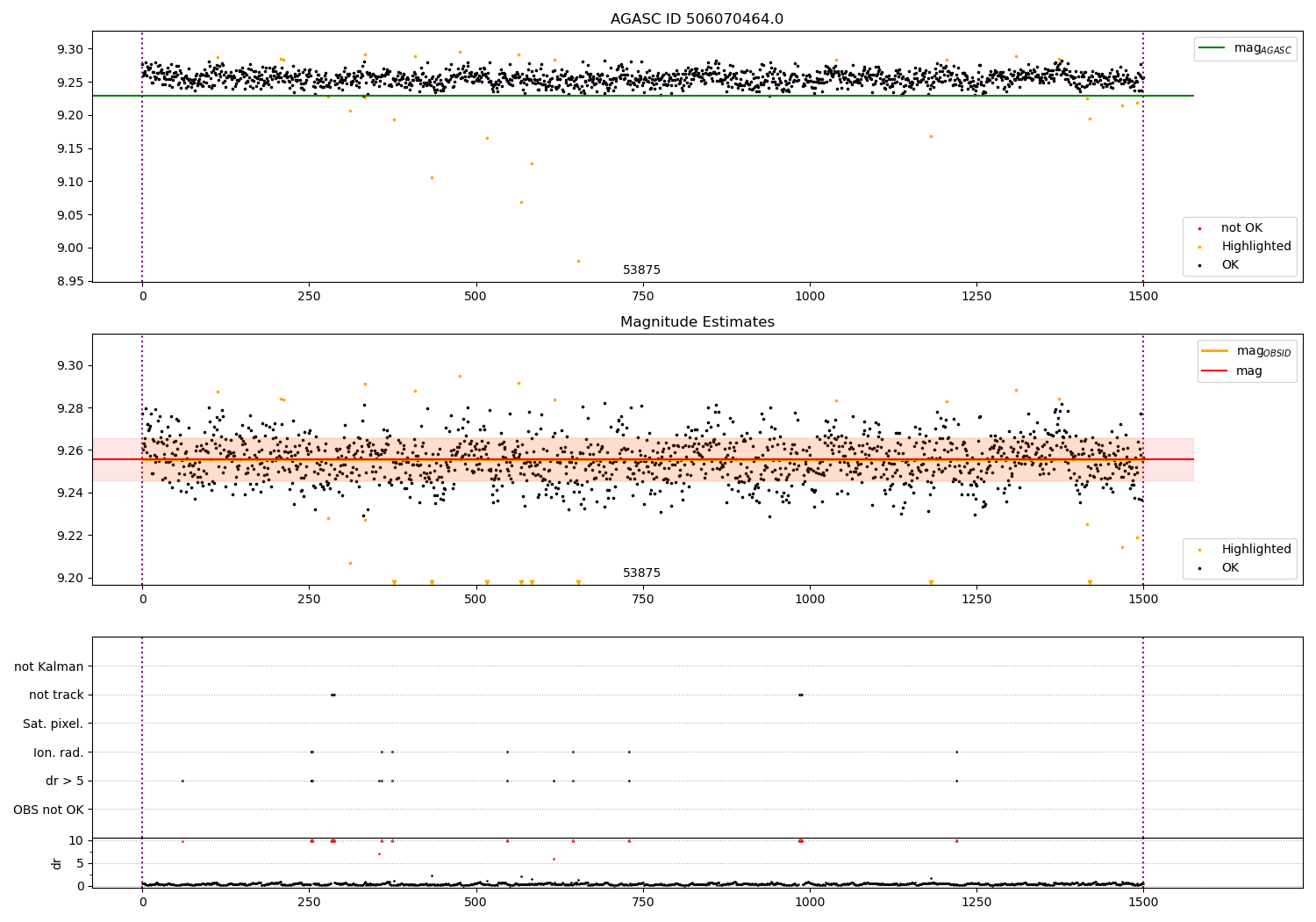 | OBSID | Time | Row | Col | N | Nok | Nout | ftrack | fdr3 | fdr5 | fok | ⟨ δ mag ⟩ 100s | ⟨ mag ⟩ | σmag | Comments |