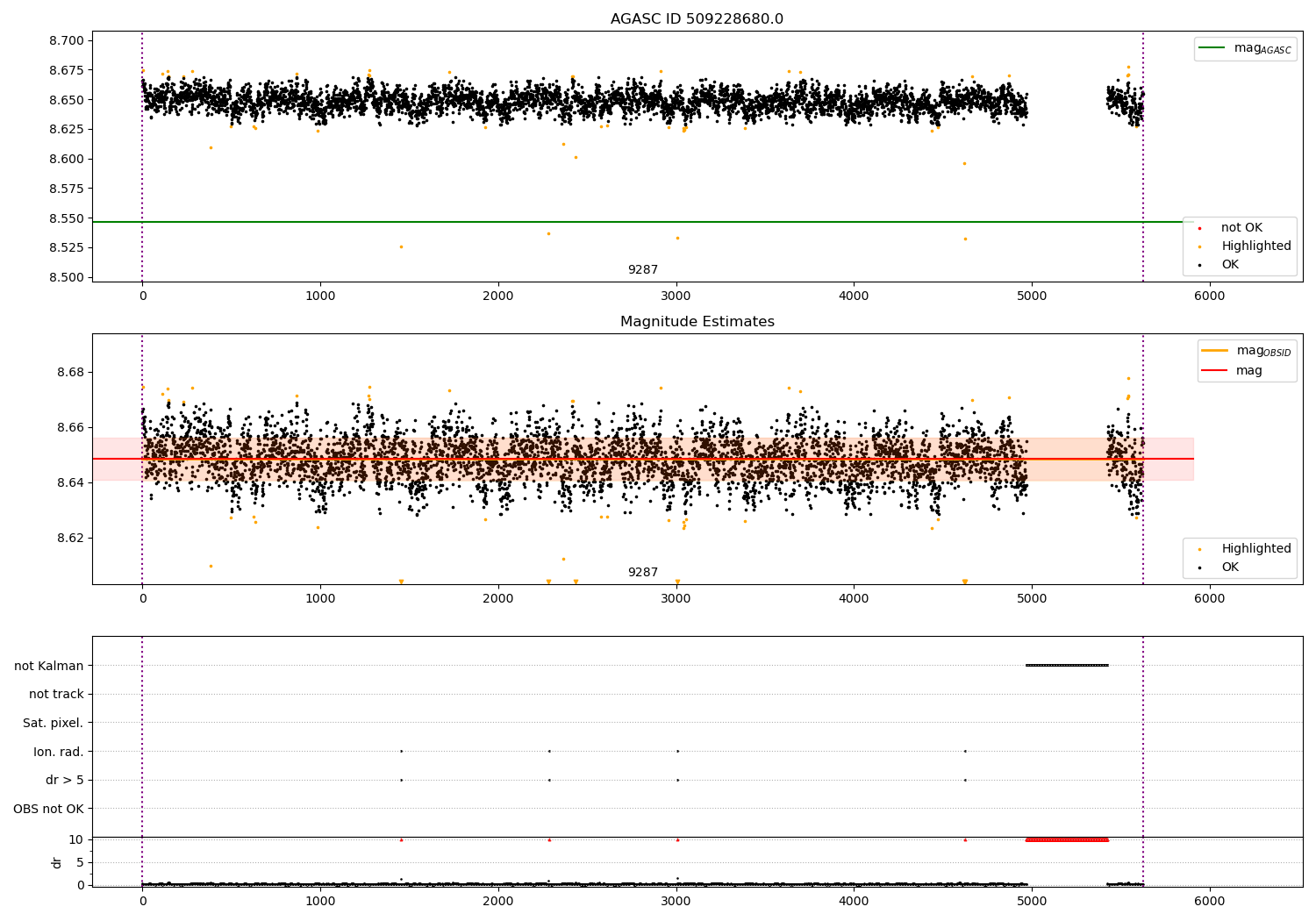 | OBSID | Time | Row | Col | N | Nok | Nout | ftrack | fdr3 | fdr5 | fok | ⟨ δ mag ⟩ 100s | ⟨ mag ⟩ | σmag | Comments |
