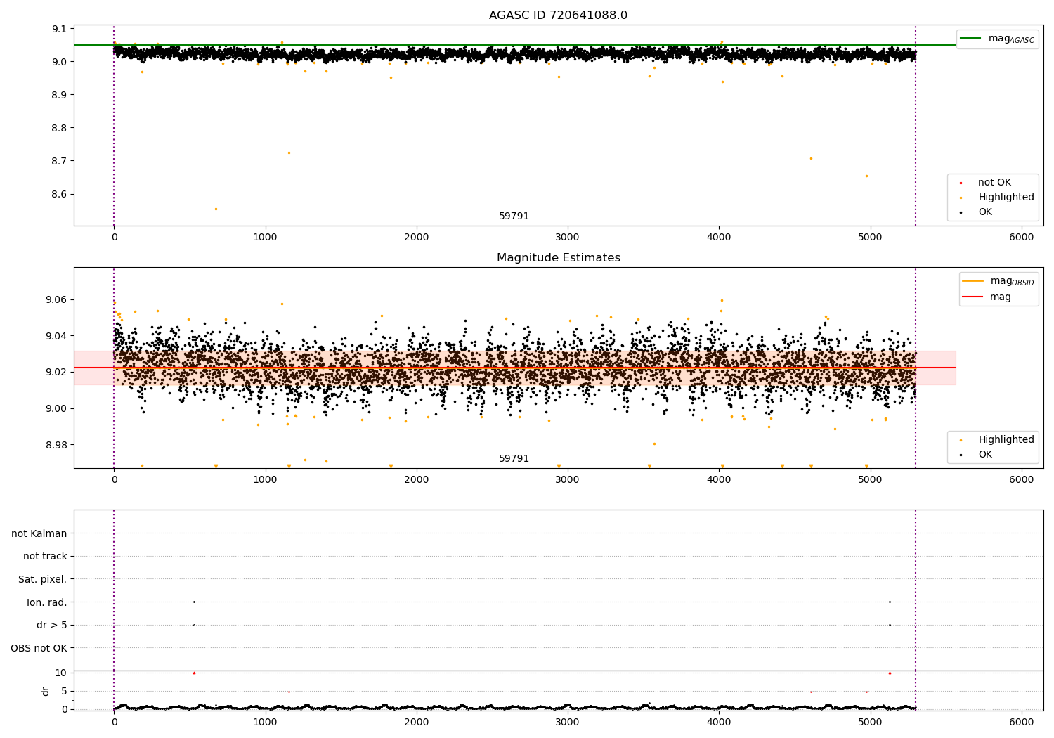 OBSID | Time | Row | Col | N | Nok | Nout | ftrack | fdr3 | fdr5 | fok | ⟨ δ mag ⟩ 100s | ⟨ mag ⟩ | σmag | Comments |