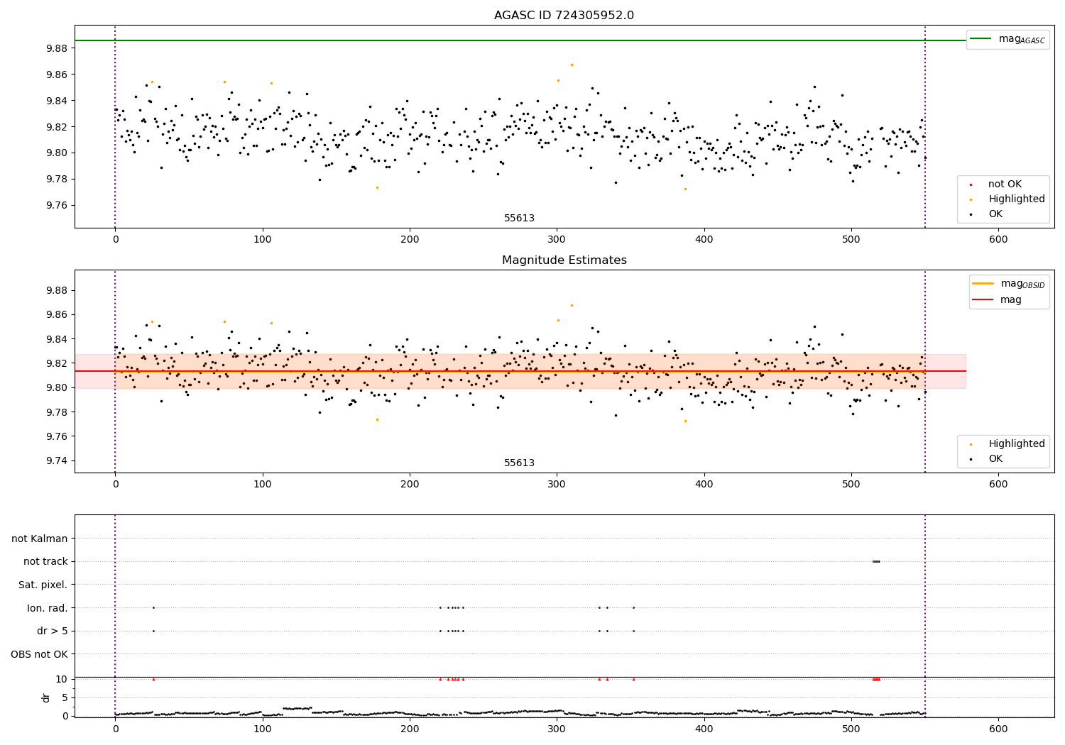 OBSID | Time | Row | Col | N | Nok | Nout | ftrack | fdr3 | fdr5 | fok | ⟨ δ mag ⟩ 100s | ⟨ mag ⟩ | σmag | Comments |