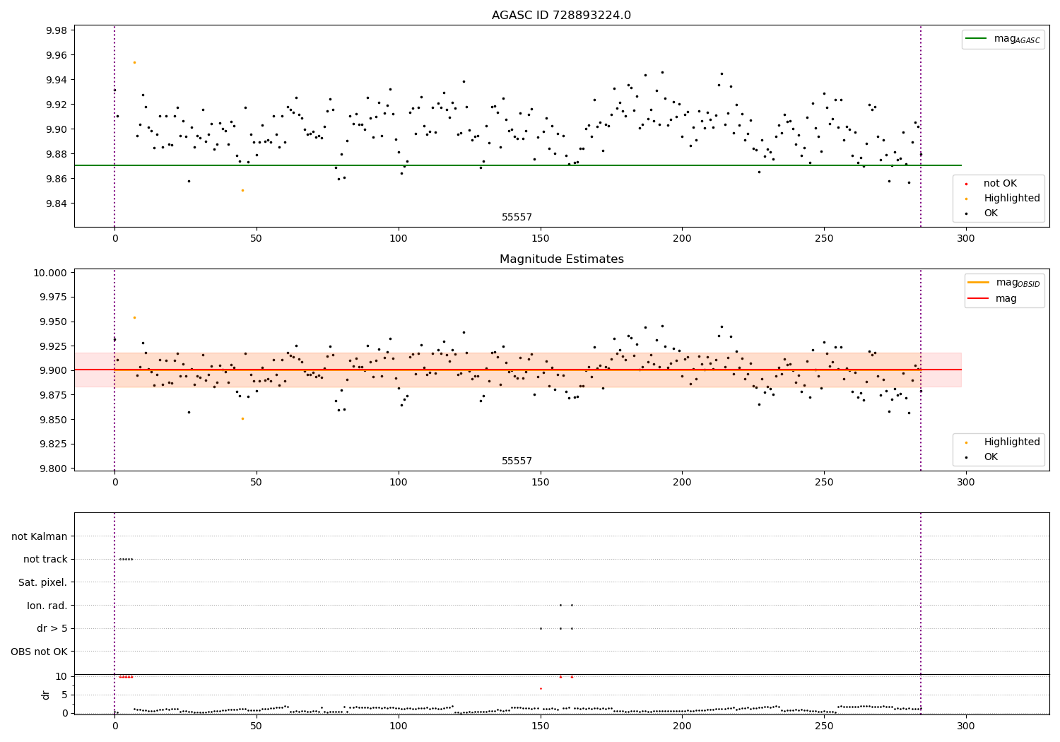 OBSID | Time | Row | Col | N | Nok | Nout | ftrack | fdr3 | fdr5 | fok | ⟨ δ mag ⟩ 100s | ⟨ mag ⟩ | σmag | Comments |