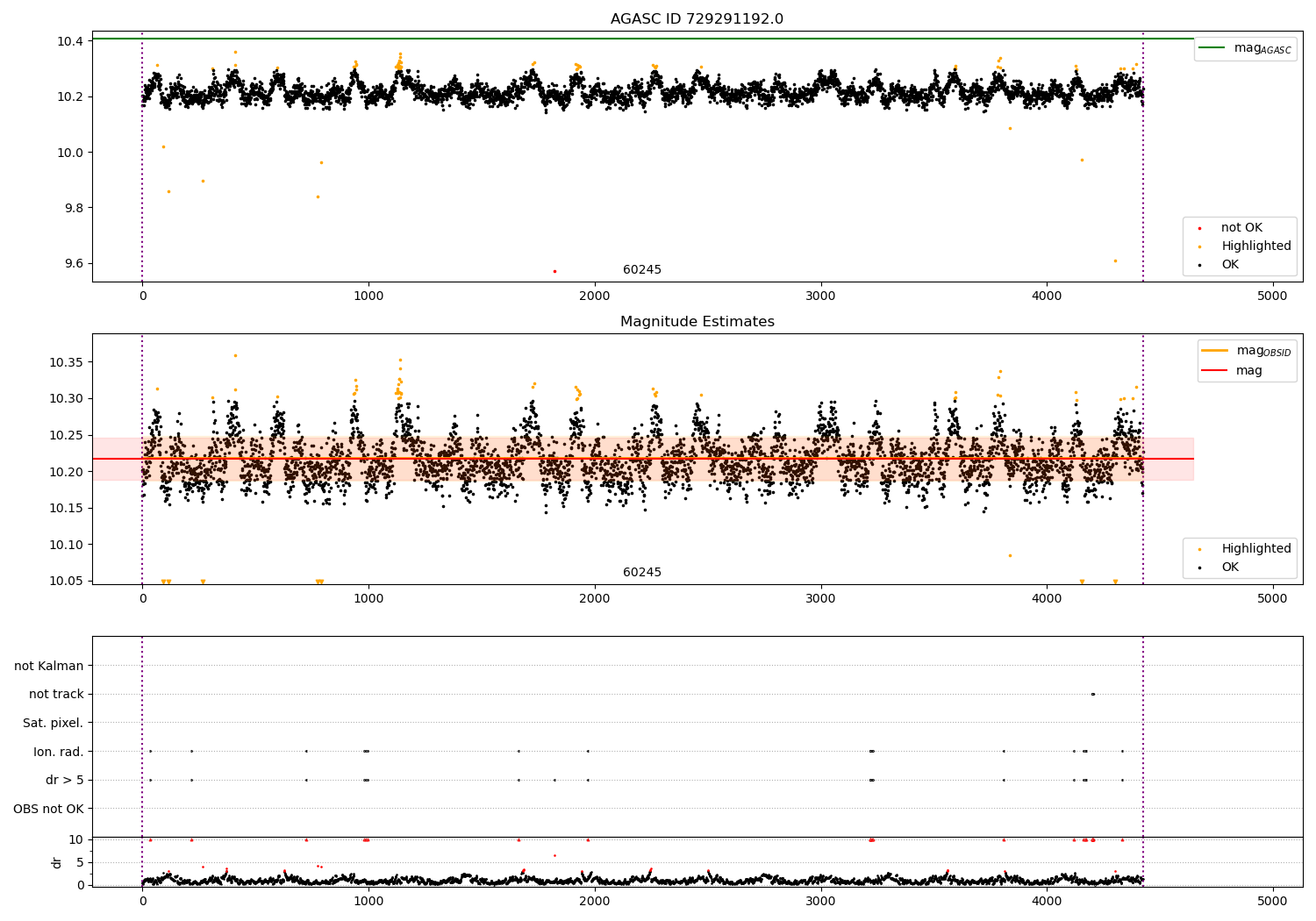 OBSID | Time | Row | Col | N | Nok | Nout | ftrack | fdr3 | fdr5 | fok | ⟨ δ mag ⟩ 100s | ⟨ mag ⟩ | σmag | Comments |