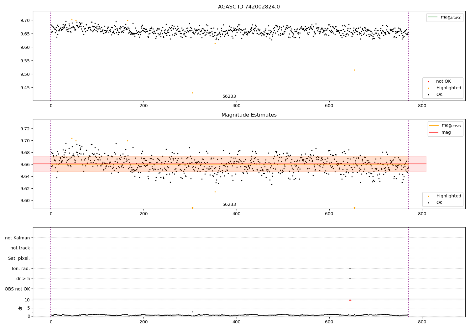 | OBSID | Time | Row | Col | N | Nok | Nout | ftrack | fdr3 | fdr5 | fok | ⟨ δ mag ⟩ 100s | ⟨ mag ⟩ | σmag | Comments |