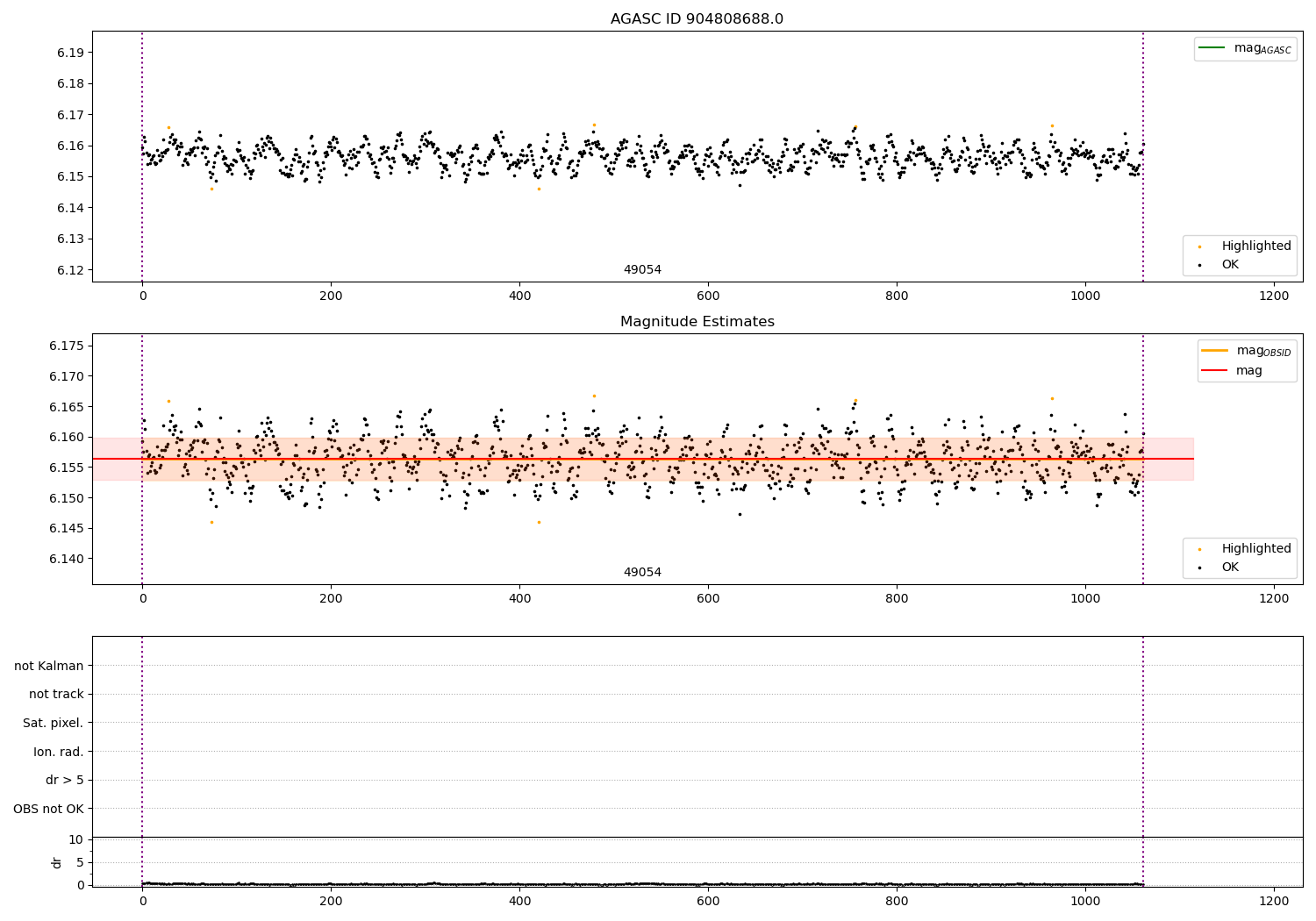 | OBSID | Time | Row | Col | N | Nok | Nout | ftrack | fdr3 | fdr5 | fok | ⟨ δ mag ⟩ 100s | ⟨ mag ⟩ | σmag | Comments |