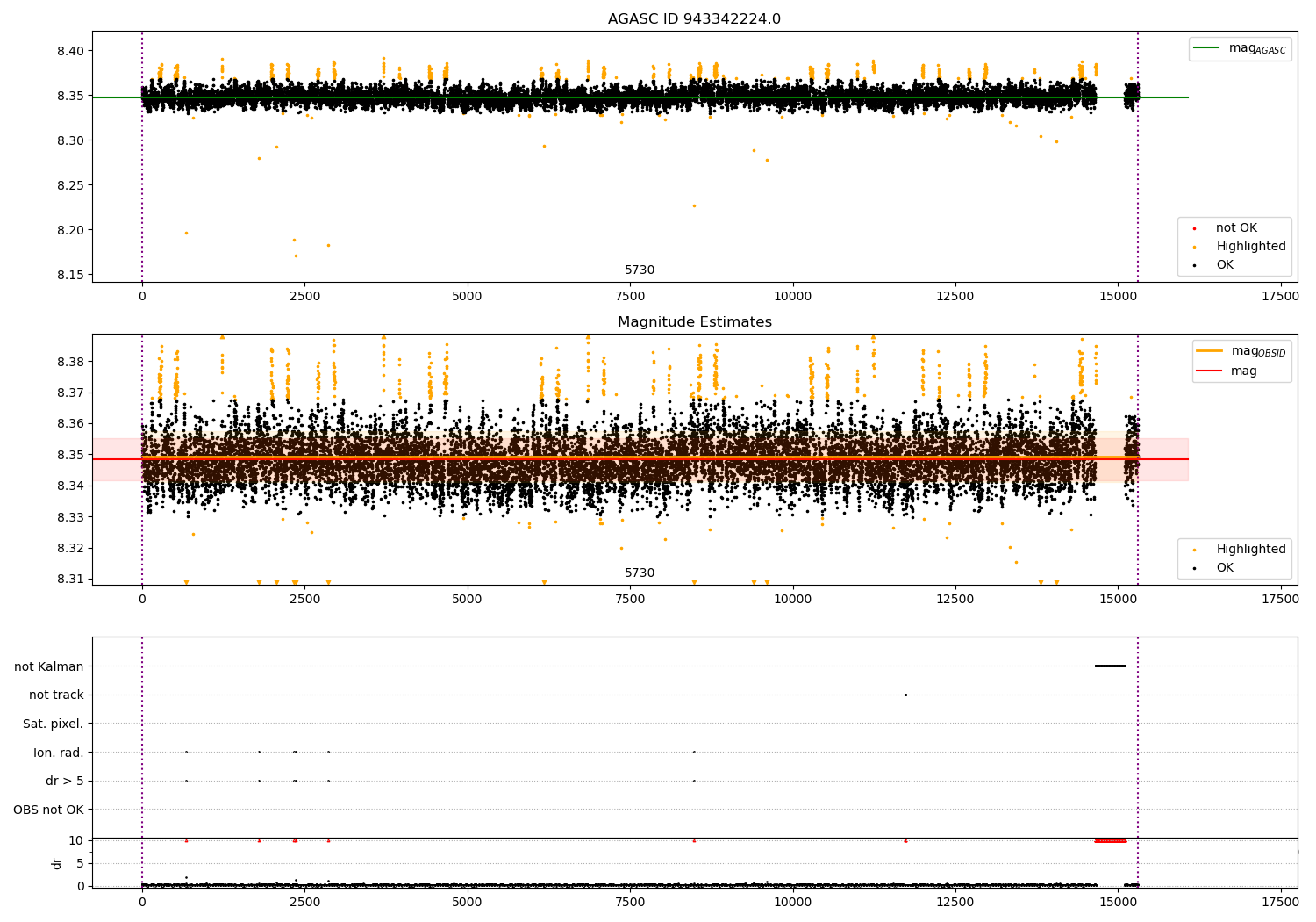 | OBSID | Time | Row | Col | N | Nok | Nout | ftrack | fdr3 | fdr5 | fok | ⟨ δ mag ⟩ 100s | ⟨ mag ⟩ | σmag | Comments |