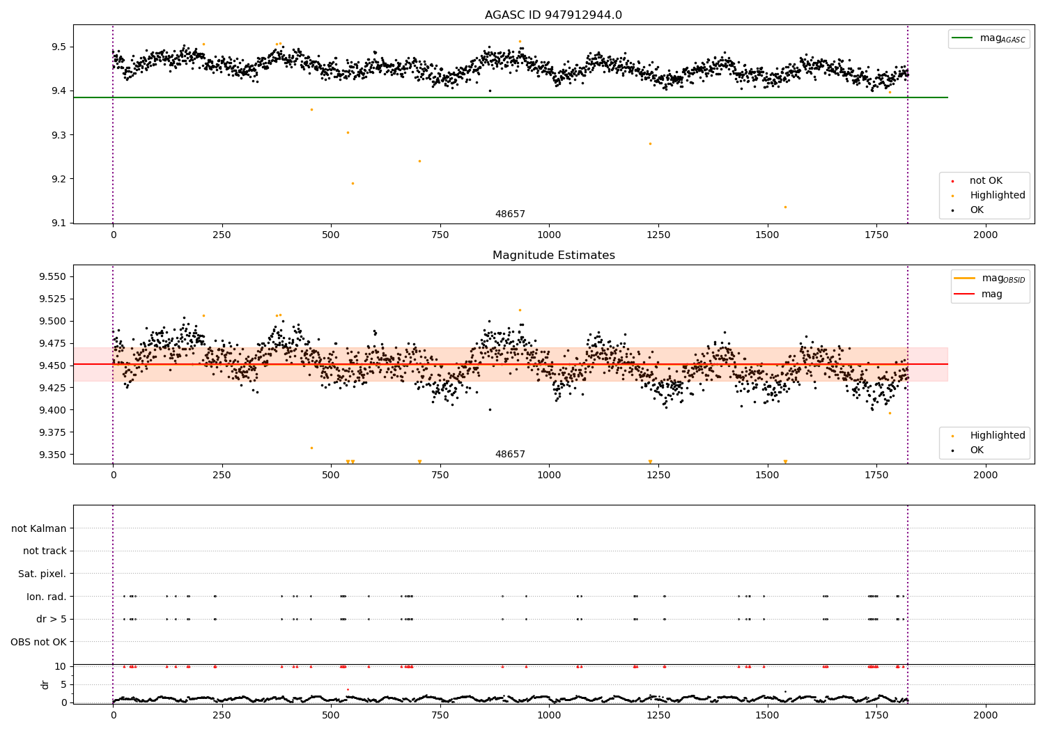 | OBSID | Time | Row | Col | N | Nok | Nout | ftrack | fdr3 | fdr5 | fok | ⟨ δ mag ⟩ 100s | ⟨ mag ⟩ | σmag | Comments |