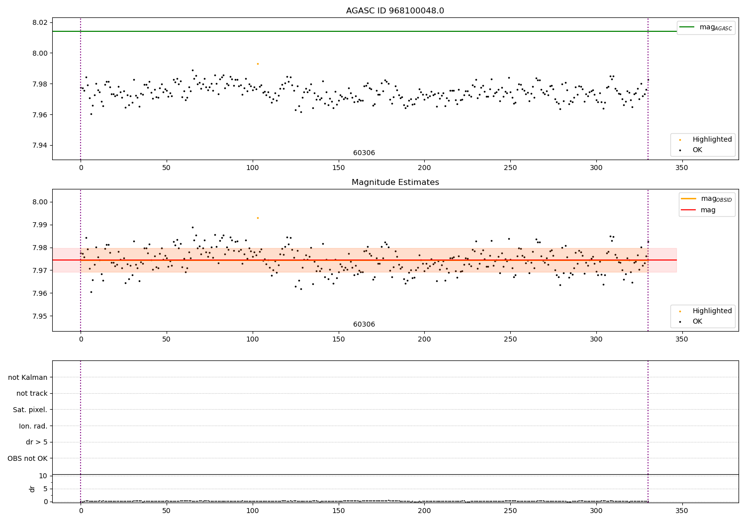 | OBSID | Time | Row | Col | N | Nok | Nout | ftrack | fdr3 | fdr5 | fok | ⟨ δ mag ⟩ 100s | ⟨ mag ⟩ | σmag | Comments |