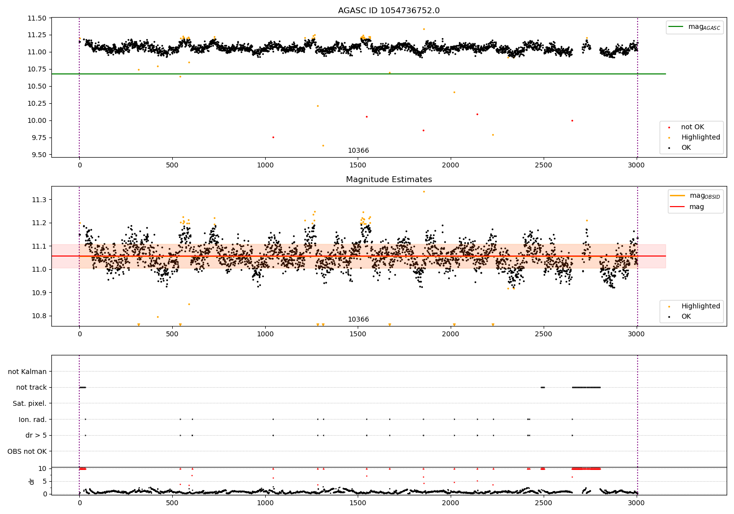 | OBSID | Time | Row | Col | N | Nok | Nout | ftrack | fdr3 | fdr5 | fok | ⟨ δ mag ⟩ 100s | ⟨ mag ⟩ | σmag | Comments |