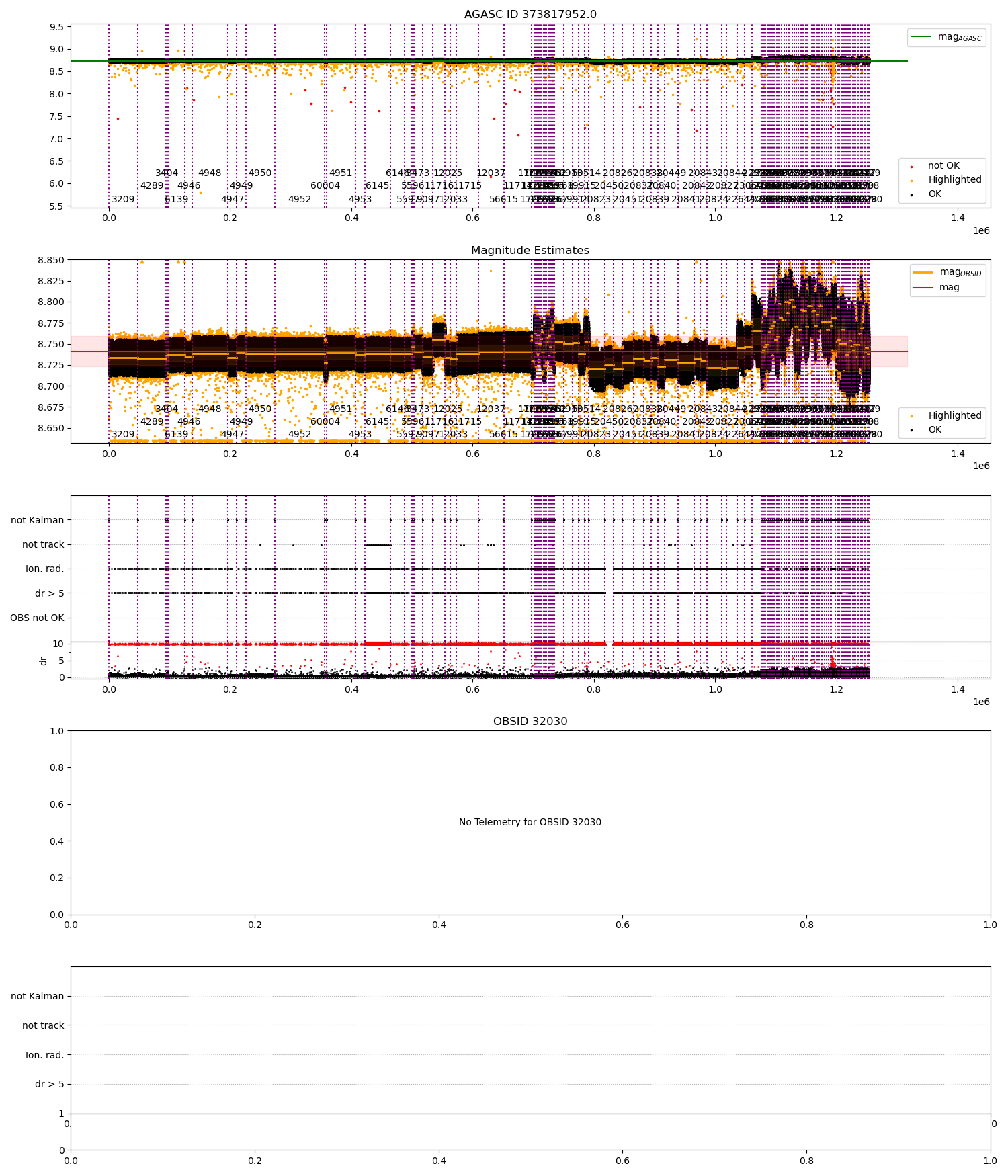 | OBSID | Time | Slot | Row | Col | N | Nmag est ok | Nout | fmag est ok | fdr3 | fdbox5 | fmag est ok 3 | ⟨ δ mag ⟩ 100s | ⟨ mag ⟩ | σmag | Comments |