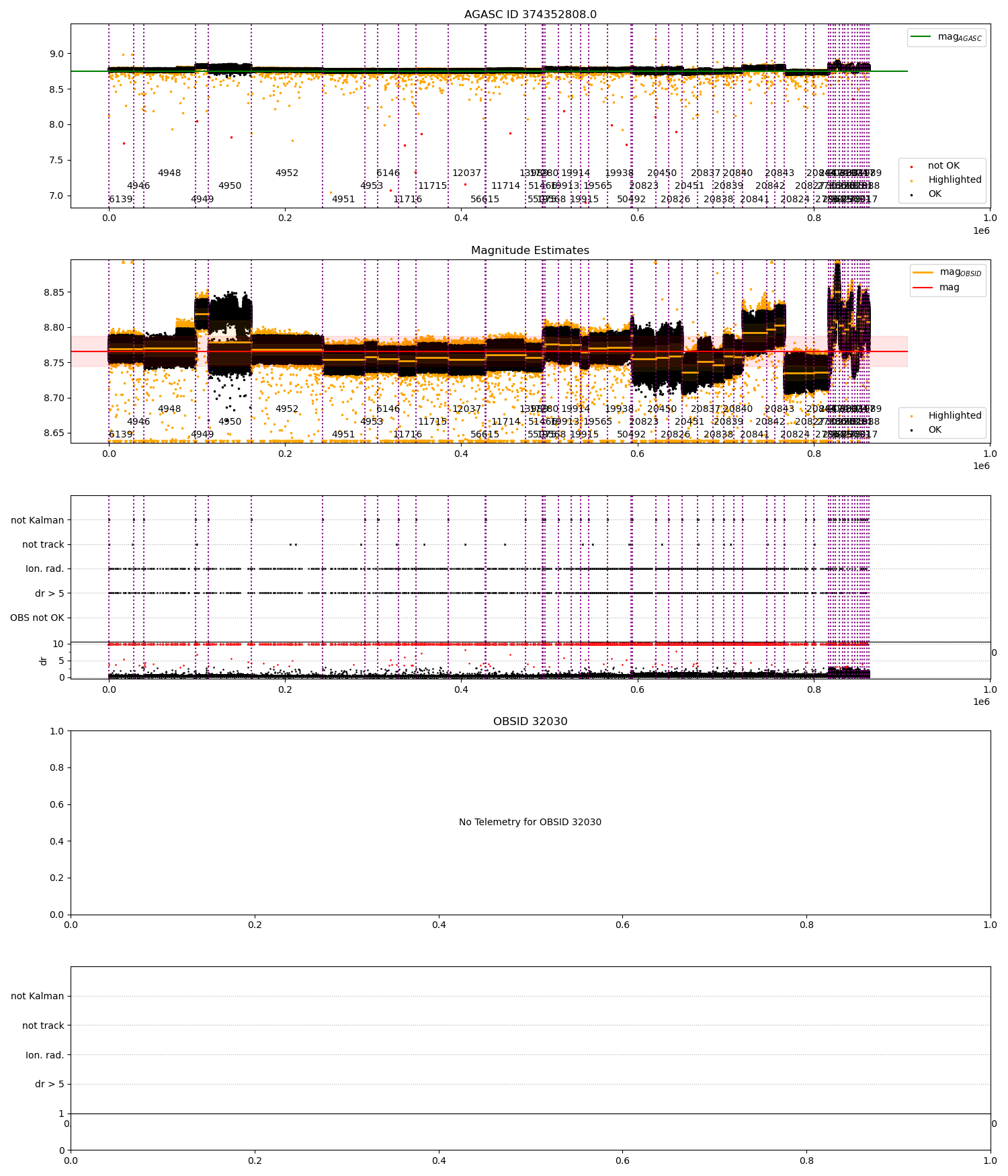 | OBSID | Time | Slot | Row | Col | N | Nmag est ok | Nout | fmag est ok | fdr3 | fdbox5 | fmag est ok 3 | ⟨ δ mag ⟩ 100s | ⟨ mag ⟩ | σmag | Comments |