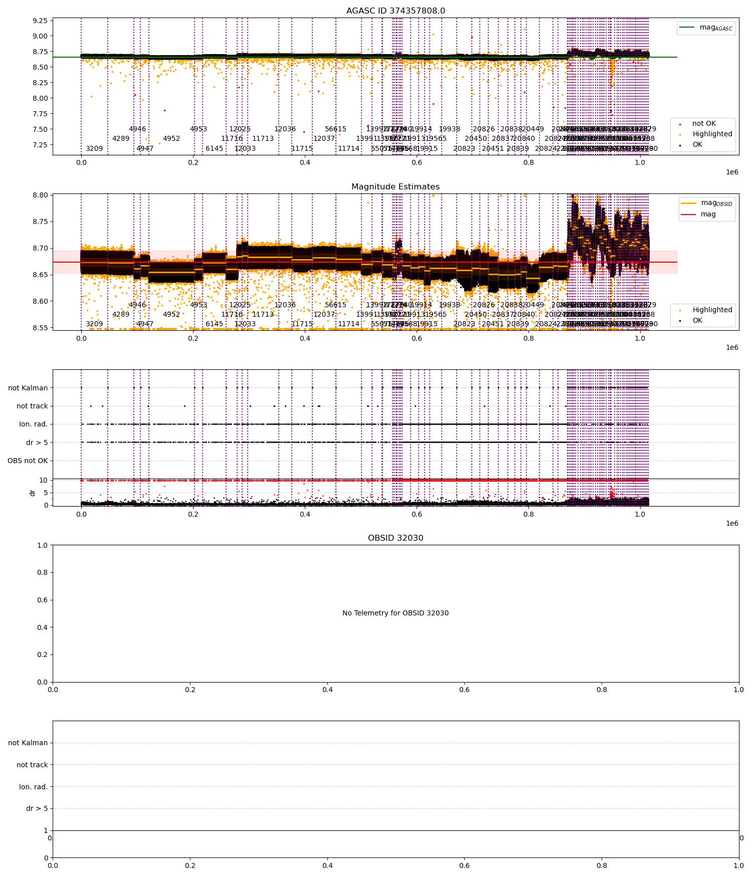 | OBSID | Time | Slot | Row | Col | N | Nmag est ok | Nout | fmag est ok | fdr3 | fdbox5 | fmag est ok 3 | ⟨ δ mag ⟩ 100s | ⟨ mag ⟩ | σmag | Comments |