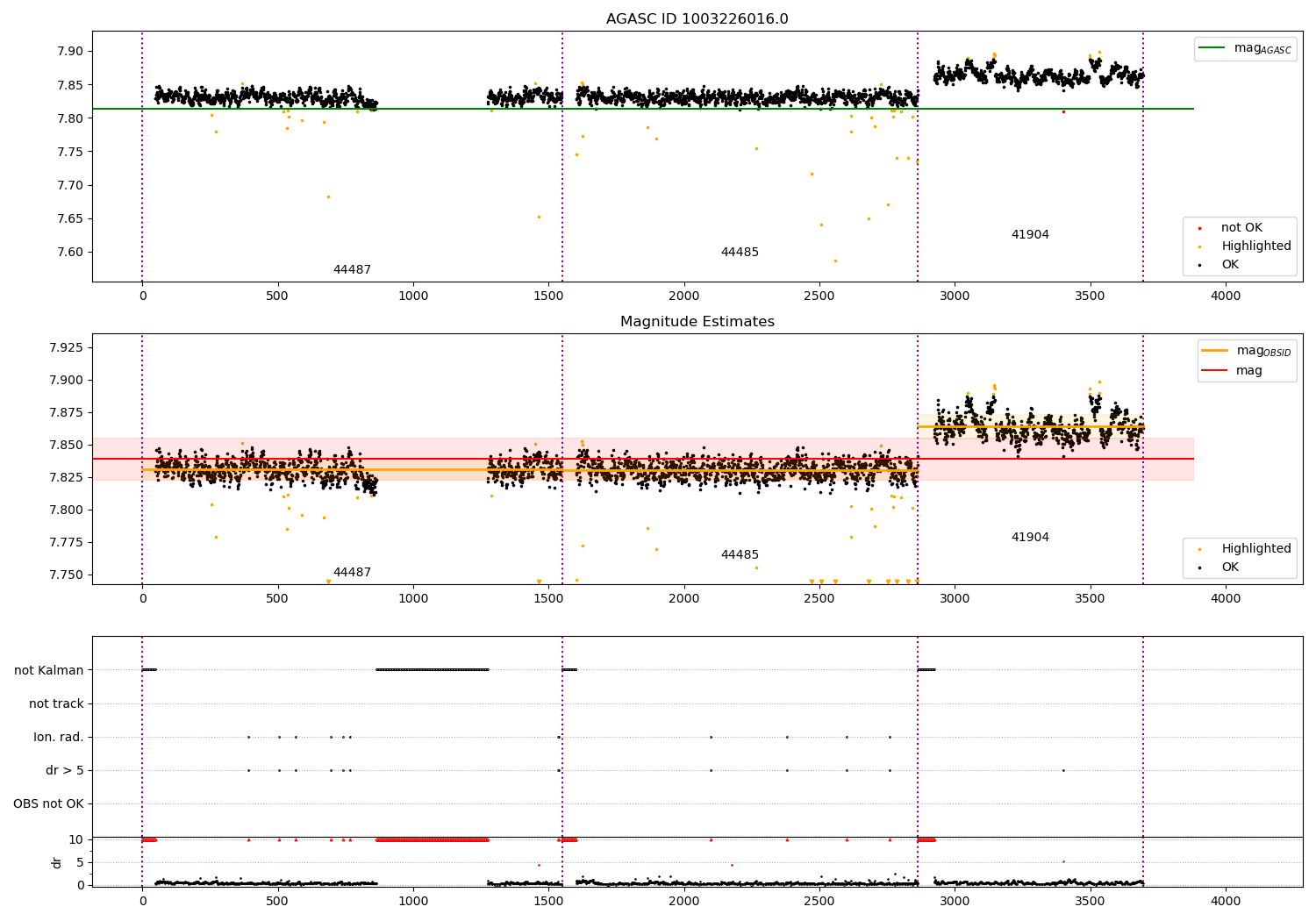 • f_ok_3: n_ok_3 / n_kalman. This is a measure of the fraction of time during an observation that the Kalman filter is getting high-quality star centroids.