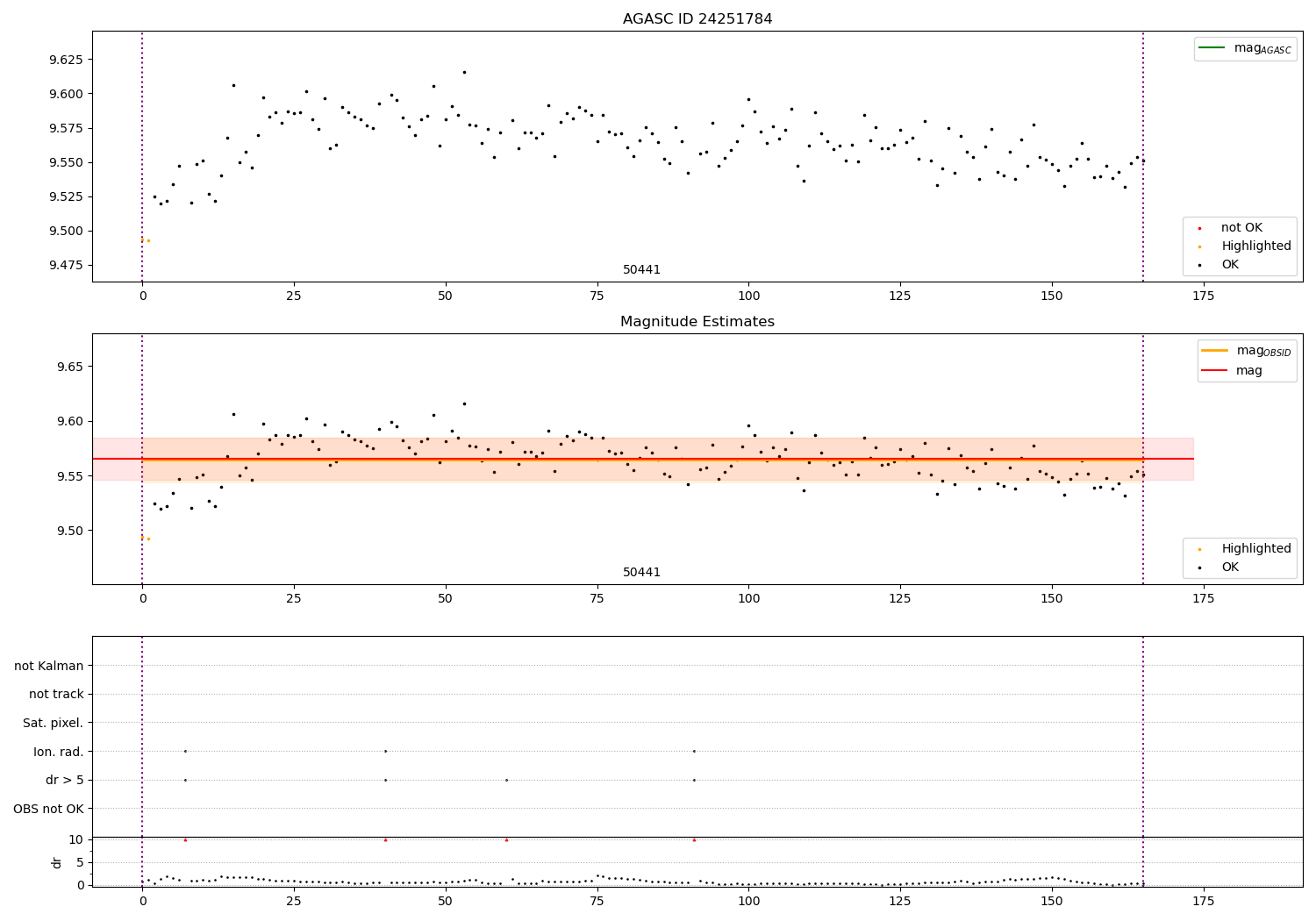 | OBSID | Time | Row | Col | N | Nok | Nout | ftrack | fdr3 | fdr5 | fok | ⟨ δ mag ⟩ 100s | ⟨ mag ⟩ | σmag | Comments |