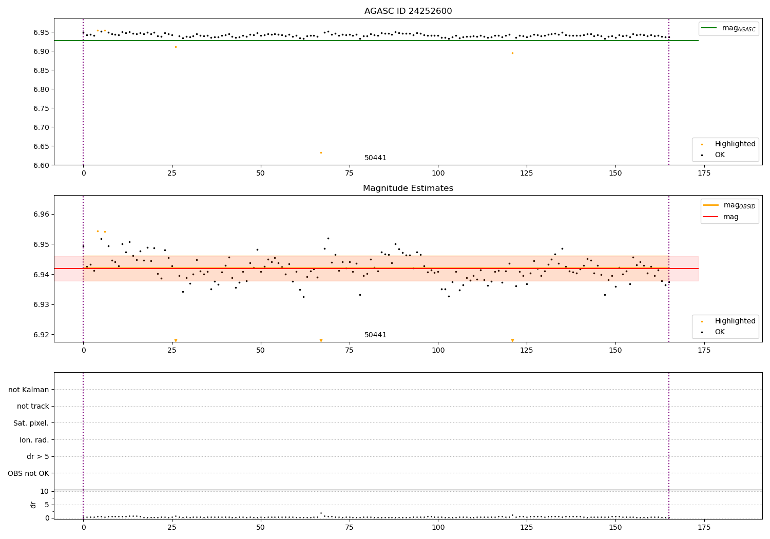 | OBSID | Time | Row | Col | N | Nok | Nout | ftrack | fdr3 | fdr5 | fok | ⟨ δ mag ⟩ 100s | ⟨ mag ⟩ | σmag | Comments |