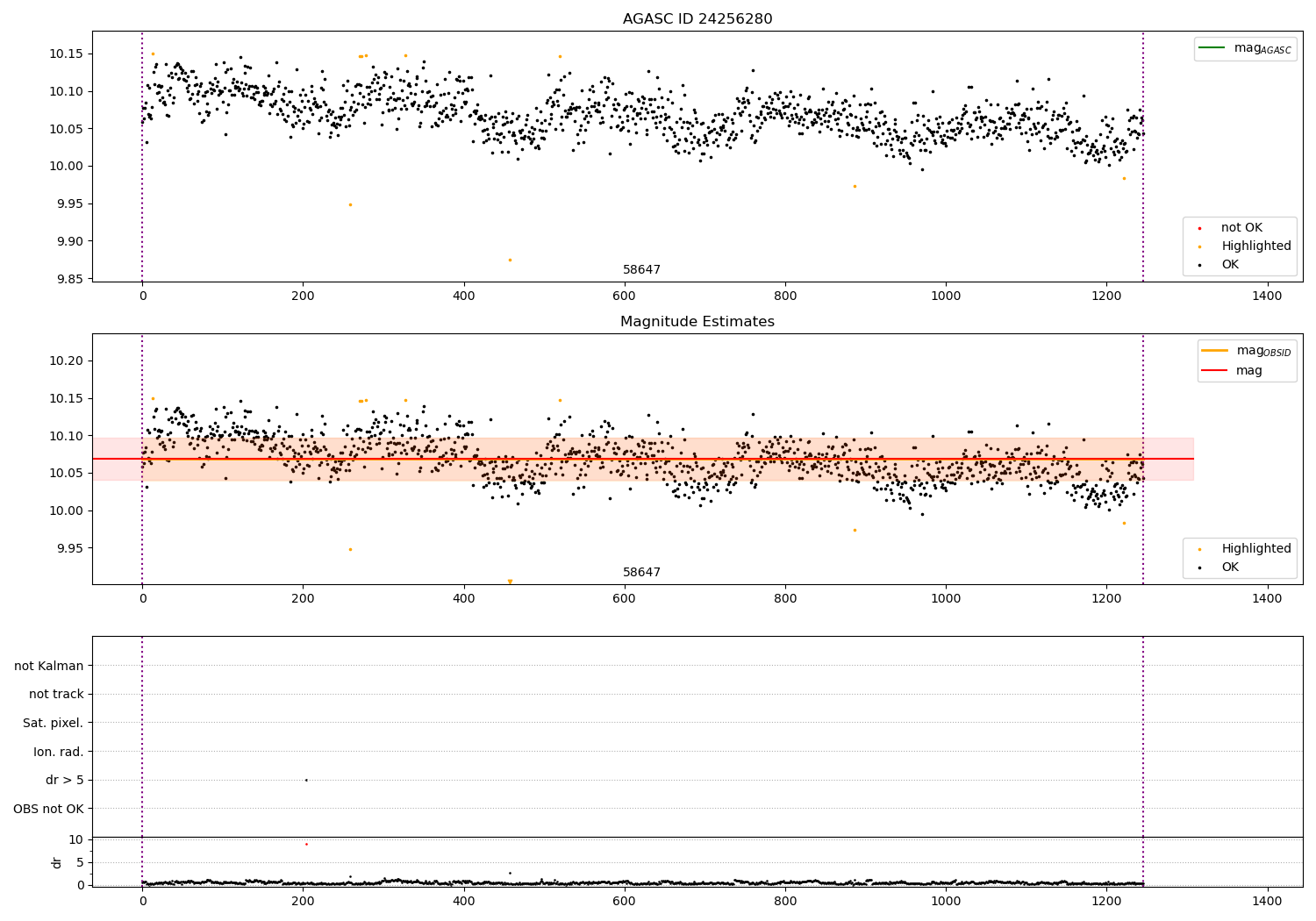| OBSID | Time | Row | Col | N | Nok | Nout | ftrack | fdr3 | fdr5 | fok | ⟨ δ mag ⟩ 100s | ⟨ mag ⟩ | σmag | Comments |