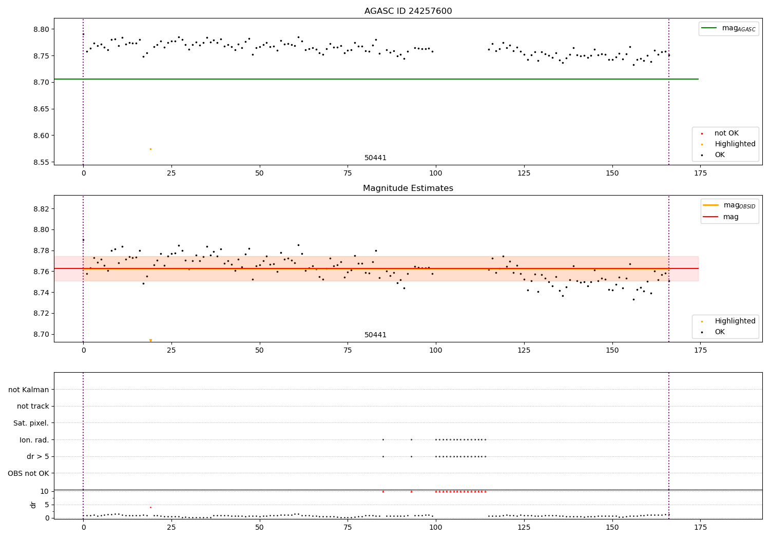 | OBSID | Time | Row | Col | N | Nok | Nout | ftrack | fdr3 | fdr5 | fok | ⟨ δ mag ⟩ 100s | ⟨ mag ⟩ | σmag | Comments |
