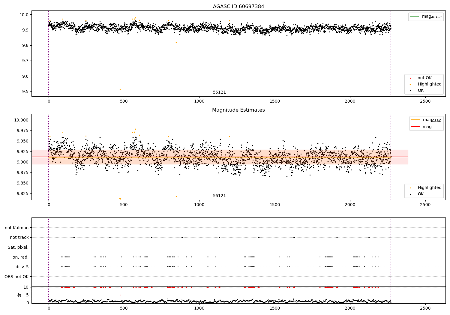 | OBSID | Time | Row | Col | N | Nok | Nout | ftrack | fdr3 | fdr5 | fok | ⟨ δ mag ⟩ 100s | ⟨ mag ⟩ | σmag | Comments |