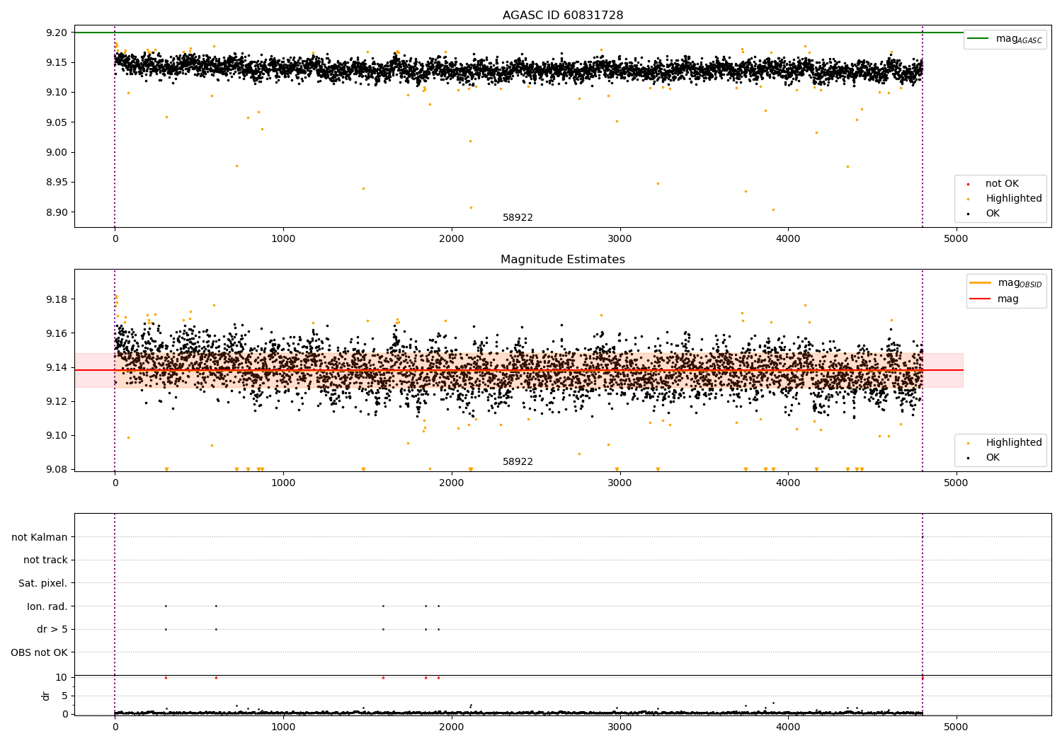 | OBSID | Time | Row | Col | N | Nok | Nout | ftrack | fdr3 | fdr5 | fok | ⟨ δ mag ⟩ 100s | ⟨ mag ⟩ | σmag | Comments |