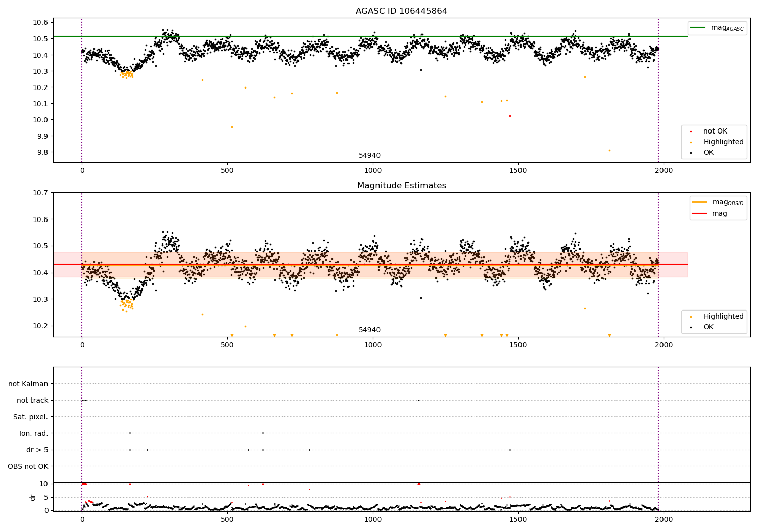 | OBSID | Time | Row | Col | N | Nok | Nout | ftrack | fdr3 | fdr5 | fok | ⟨ δ mag ⟩ 100s | ⟨ mag ⟩ | σmag | Comments |