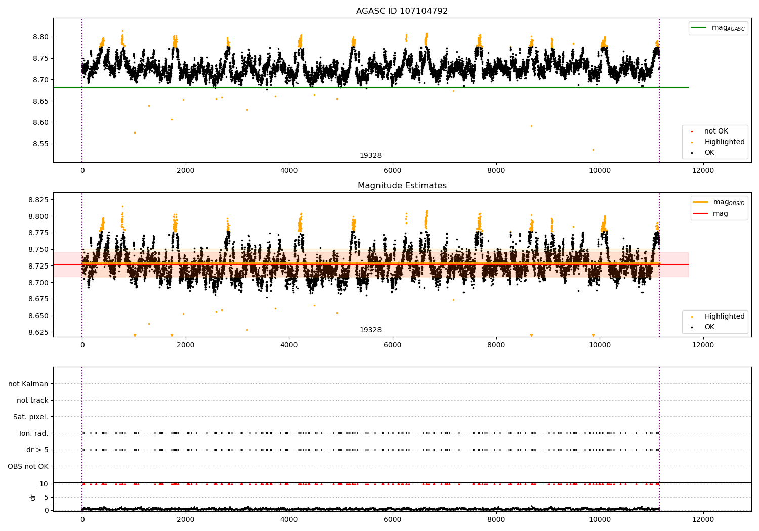 | OBSID | Time | Row | Col | N | Nok | Nout | ftrack | fdr3 | fdr5 | fok | ⟨ δ mag ⟩ 100s | ⟨ mag ⟩ | σmag | Comments |