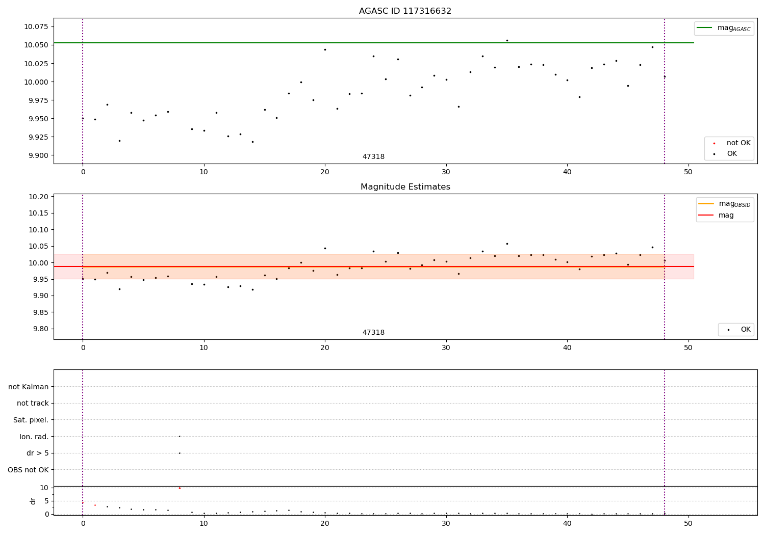 | OBSID | Time | Row | Col | N | Nok | Nout | ftrack | fdr3 | fdr5 | fok | ⟨ δ mag ⟩ 100s | ⟨ mag ⟩ | σmag | Comments |