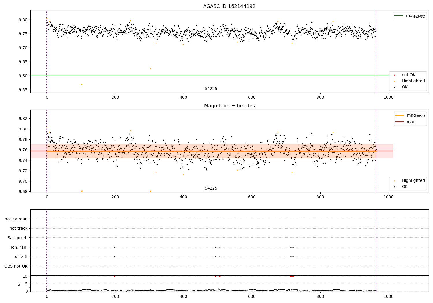 | OBSID | Time | Row | Col | N | Nok | Nout | ftrack | fdr3 | fdr5 | fok | ⟨ δ mag ⟩ 100s | ⟨ mag ⟩ | σmag | Comments |