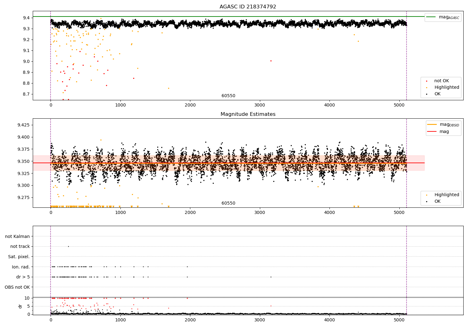 | OBSID | Time | Row | Col | N | Nok | Nout | ftrack | fdr3 | fdr5 | fok | ⟨ δ mag ⟩ 100s | ⟨ mag ⟩ | σmag | Comments |