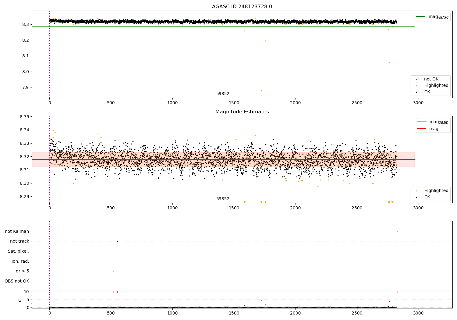 | OBSID | Time | Row | Col | N | Nok | Nout | ftrack | fdr3 | fdr5 | fok | ⟨ δ mag ⟩ 100s | ⟨ mag ⟩ | σmag | Comments |