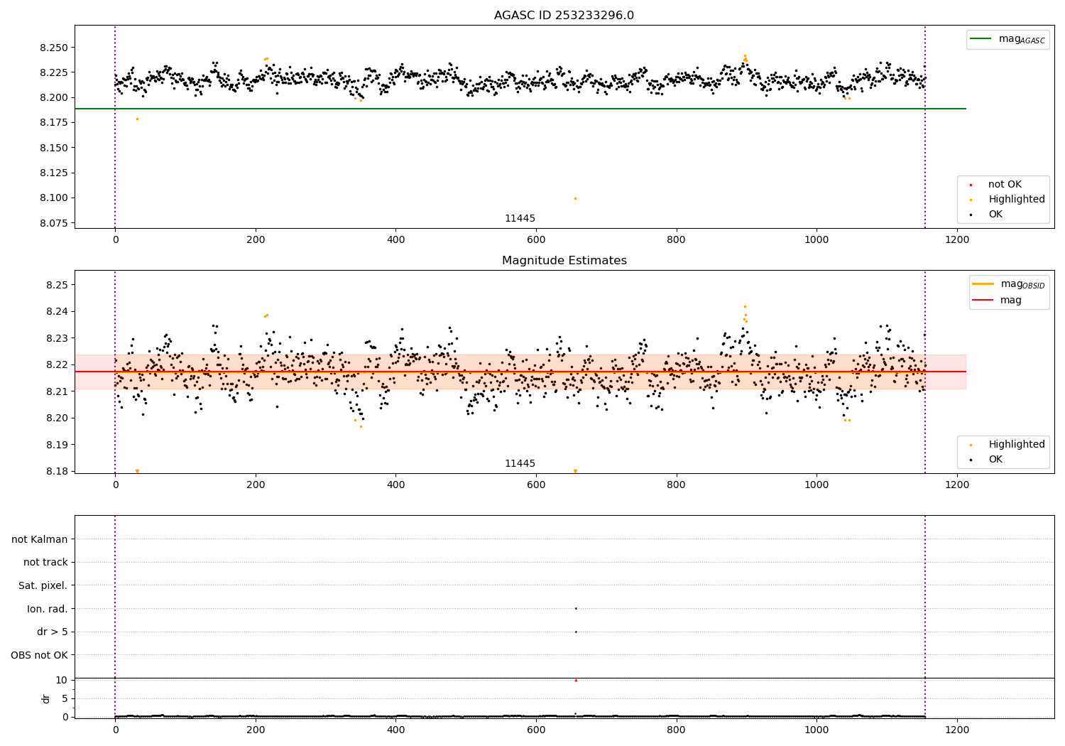 | OBSID | Time | Row | Col | N | Nok | Nout | ftrack | fdr3 | fdr5 | fok | ⟨ δ mag ⟩ 100s | ⟨ mag ⟩ | σmag | Comments |
