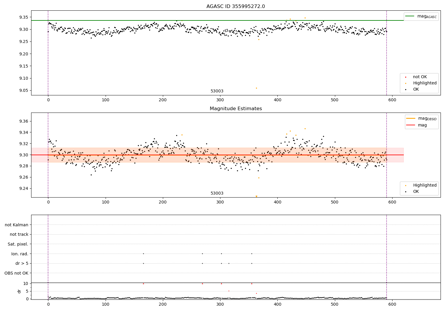 | OBSID | Time | Row | Col | N | Nok | Nout | ftrack | fdr3 | fdr5 | fok | ⟨ δ mag ⟩ 100s | ⟨ mag ⟩ | σmag | Comments |