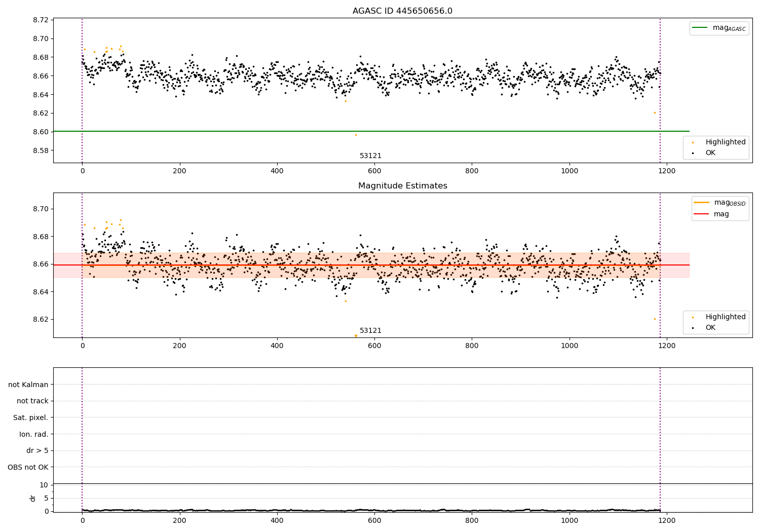 | OBSID | Time | Row | Col | N | Nok | Nout | ftrack | fdr3 | fdr5 | fok | ⟨ δ mag ⟩ 100s | ⟨ mag ⟩ | σmag | Comments |
