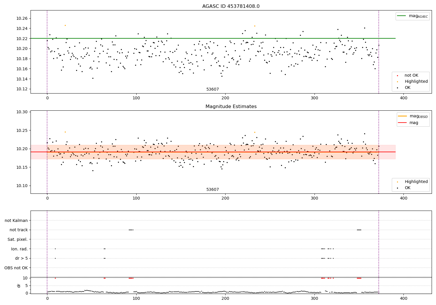 | OBSID | Time | Row | Col | N | Nok | Nout | ftrack | fdr3 | fdr5 | fok | ⟨ δ mag ⟩ 100s | ⟨ mag ⟩ | σmag | Comments |