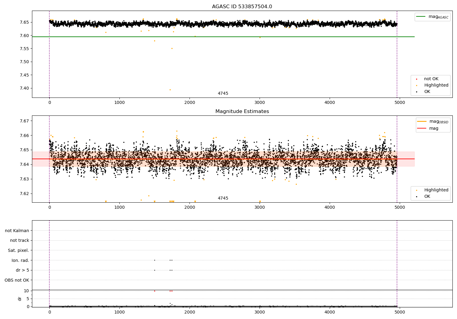 | OBSID | Time | Row | Col | N | Nok | Nout | ftrack | fdr3 | fdr5 | fok | ⟨ δ mag ⟩ 100s | ⟨ mag ⟩ | σmag | Comments |