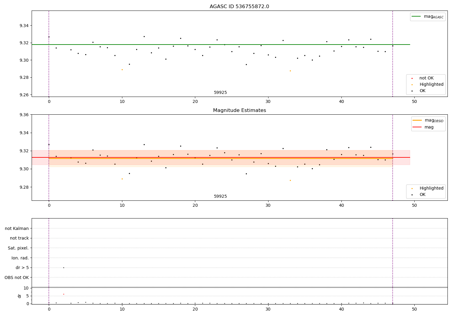 | OBSID | Time | Row | Col | N | Nok | Nout | ftrack | fdr3 | fdr5 | fok | ⟨ δ mag ⟩ 100s | ⟨ mag ⟩ | σmag | Comments |