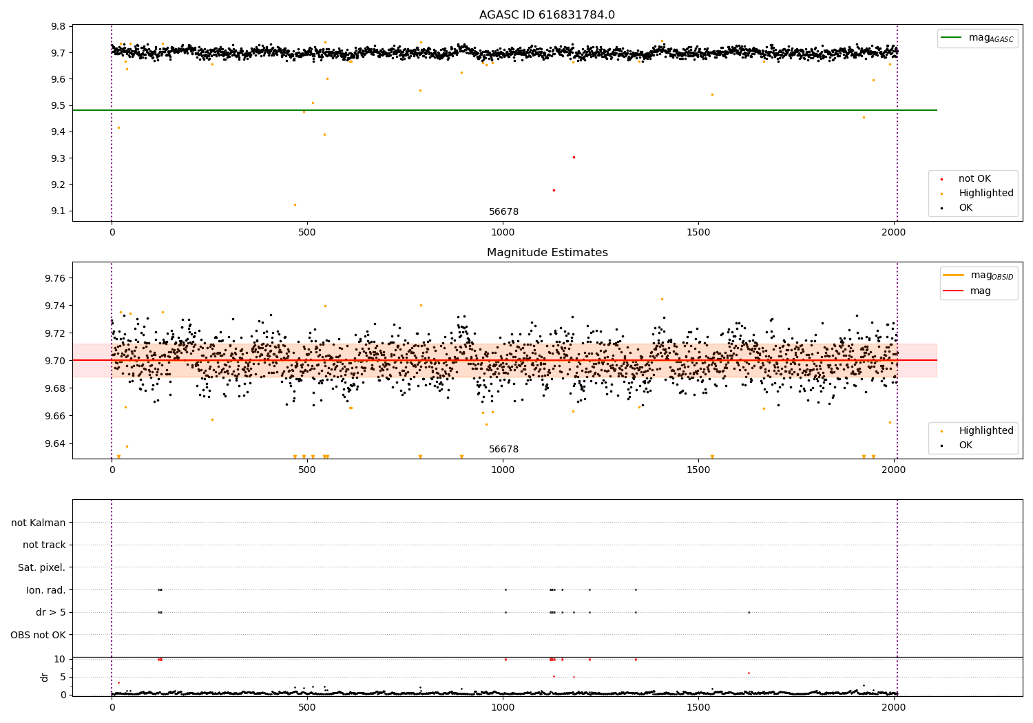 | OBSID | Time | Row | Col | N | Nok | Nout | ftrack | fdr3 | fdr5 | fok | ⟨ δ mag ⟩ 100s | ⟨ mag ⟩ | σmag | Comments |