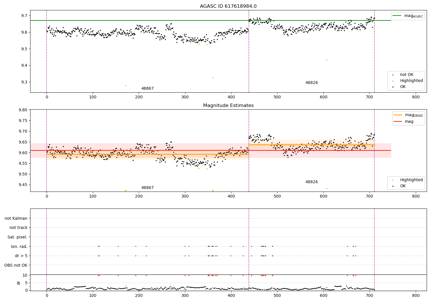 | OBSID | Time | Row | Col | N | Nok | Nout | ftrack | fdr3 | fdr5 | fok | ⟨ δ mag ⟩ 100s | ⟨ mag ⟩ | σmag | Comments |