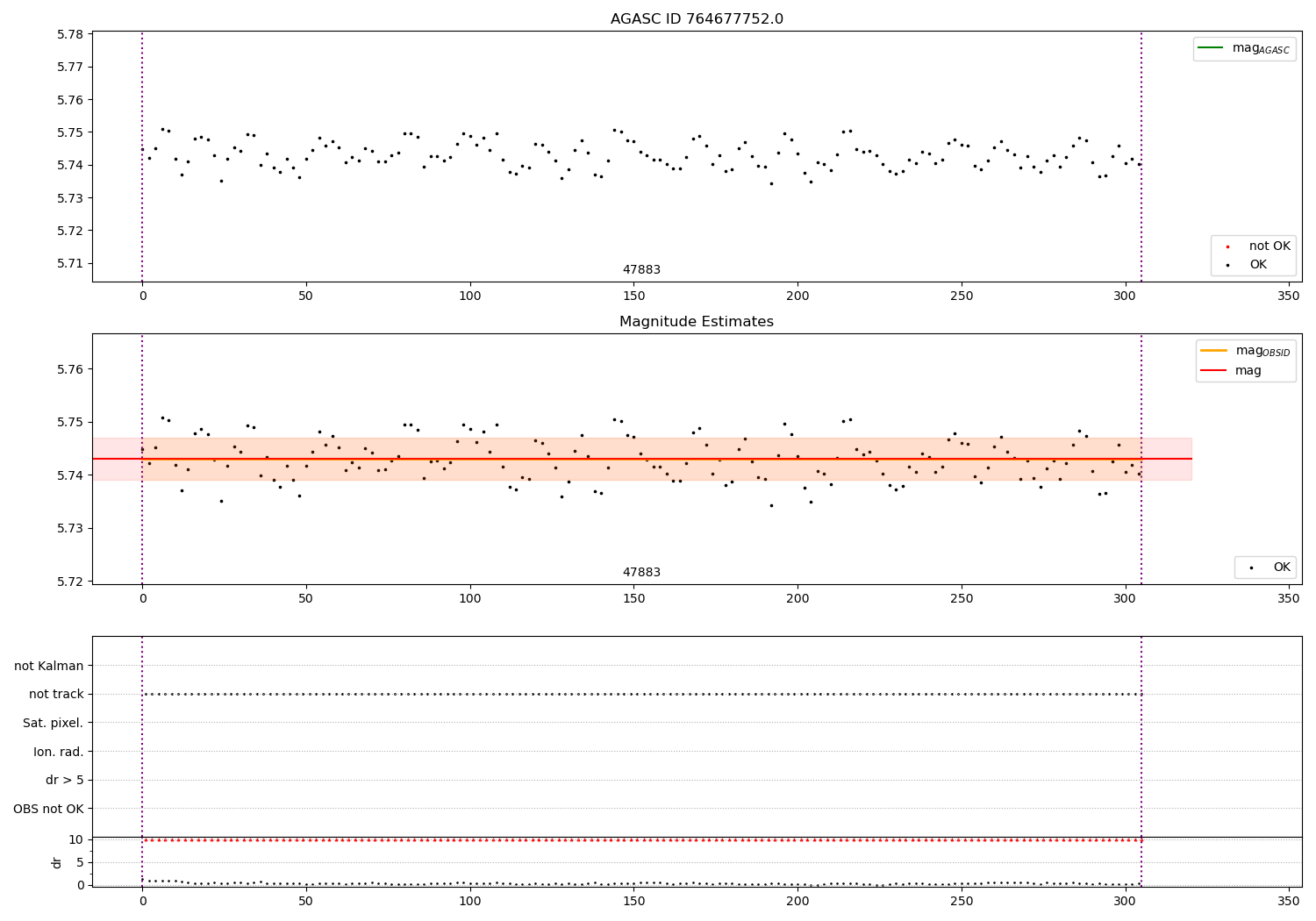 | OBSID | Time | Row | Col | N | Nok | Nout | ftrack | fdr3 | fdr5 | fok | ⟨ δ mag ⟩ 100s | ⟨ mag ⟩ | σmag | Comments |