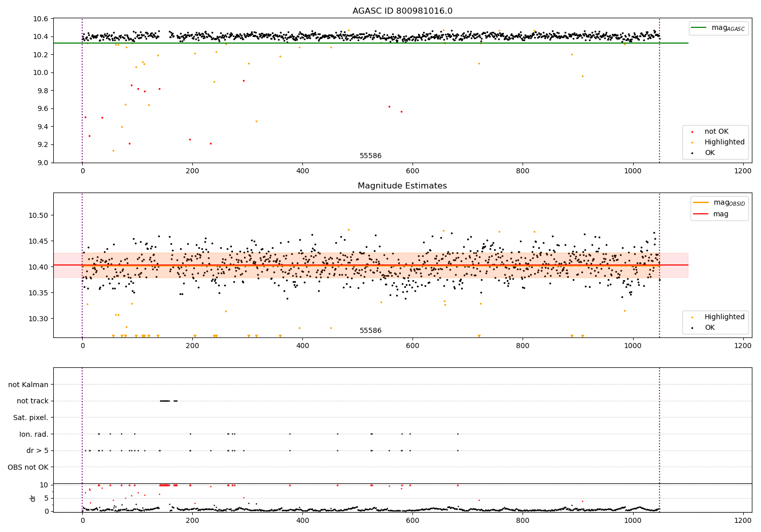 | OBSID | Time | Row | Col | N | Nok | Nout | ftrack | fdr3 | fdr5 | fok | ⟨ δ mag ⟩ 100s | ⟨ mag ⟩ | σmag | Comments |