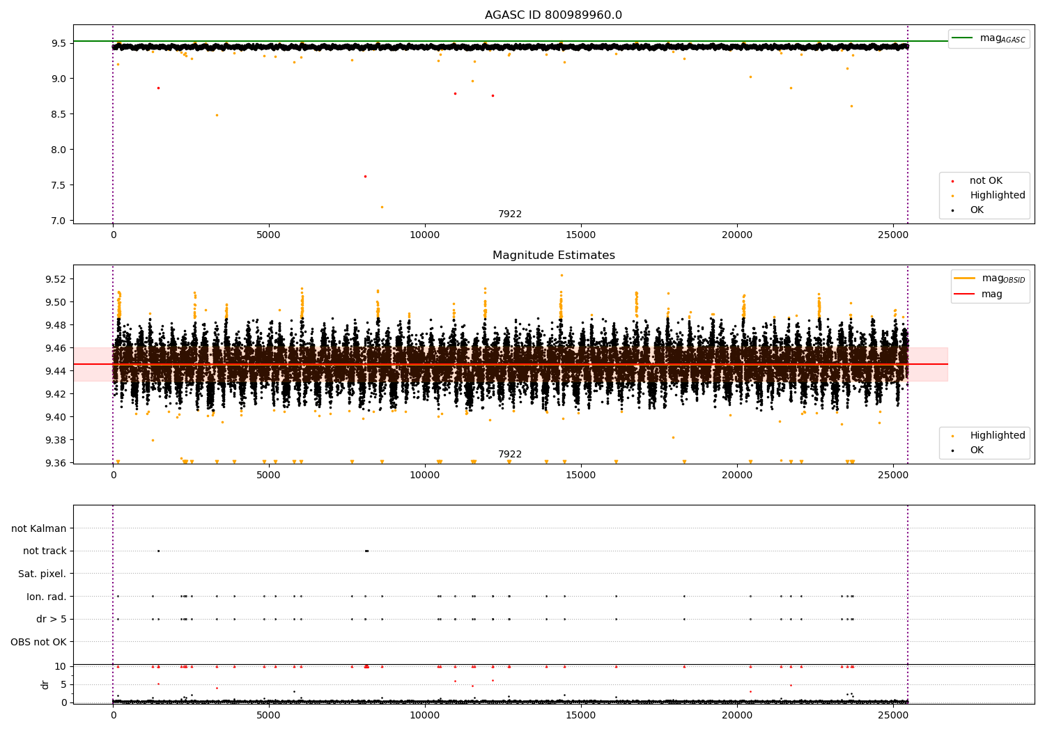| OBSID | Time | Row | Col | N | Nok | Nout | ftrack | fdr3 | fdr5 | fok | ⟨ δ mag ⟩ 100s | ⟨ mag ⟩ | σmag | Comments |