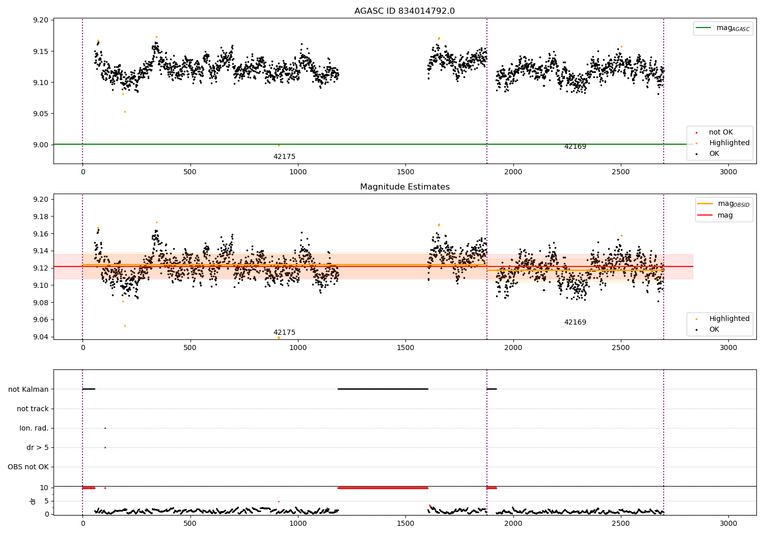 • dr3: Subset of tracked Kalman samples with radial centroid residual < 3 arcsec. This corresponds to "high quality" readouts. This effectively includes the track subset (AOACFCT == TRAK) because readouts with no TRAK are assigned an infinite centroid residual.