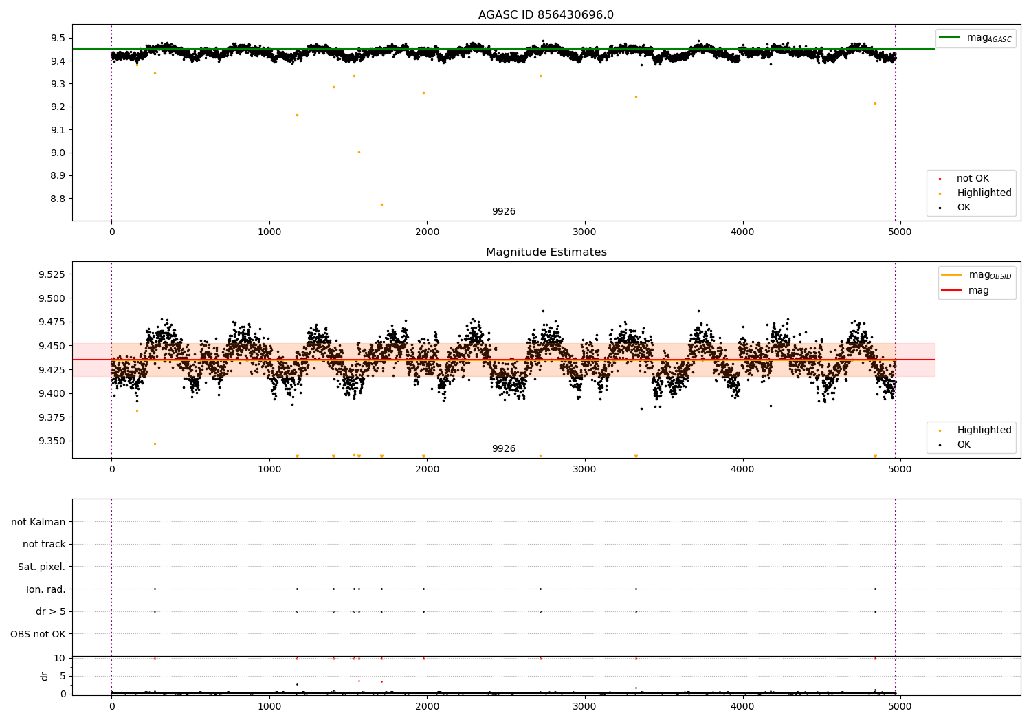 | OBSID | Time | Row | Col | N | Nok | Nout | ftrack | fdr3 | fdr5 | fok | ⟨ δ mag ⟩ 100s | ⟨ mag ⟩ | σmag | Comments |
